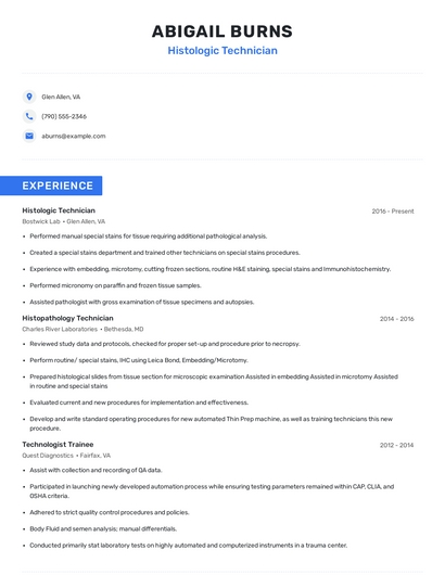 Build a professional histologic technician resume in minutes. Browse through our resume examples to identify the best way to word your resume. Then choose from 5+ resume templates to create your histologic technician resume.
