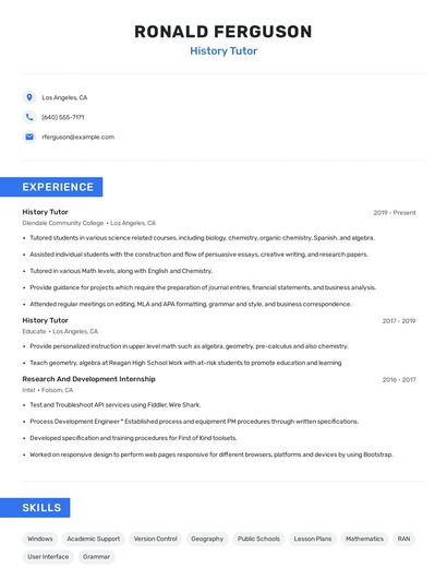 Build a professional history tutor resume in minutes. Browse through our resume examples to identify the best way to word your resume. Then choose from 5+ resume templates to create your history tutor resume.