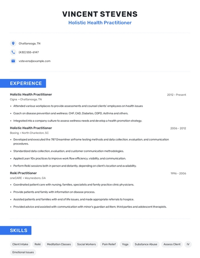 Build a professional holistic health practitioner resume in minutes. Browse through our resume examples to identify the best way to word your resume. Then choose from 5+ resume templates to create your holistic health practitioner resume.