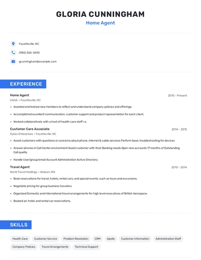 Build a professional home agent resume in minutes. Our AI resume writing assistant will guide you through every step of the process, and you can choose from 10+ resume templates to create your home agent resume.7. Customer Care