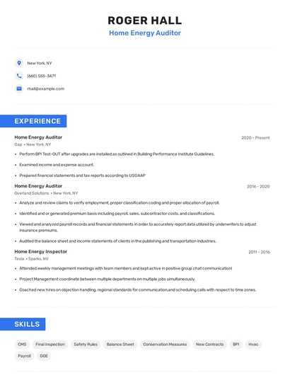Build a professional home energy auditor resume in minutes. Browse through our resume examples to identify the best way to word your resume. Then choose from 5+ resume templates to create your home energy auditor resume.