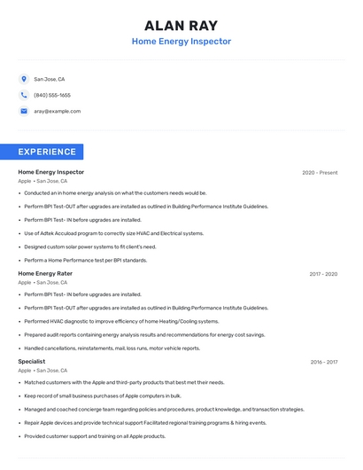 The most important skills for a home energy inspector resume and required skills for a home energy inspector to have include: