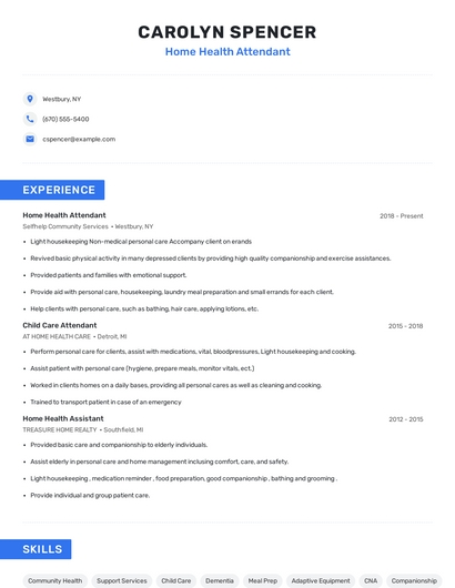 Build a professional home health attendant resume in minutes. Browse through our resume examples to identify the best way to word your resume. Then choose from 5+ resume templates to create your home health attendant resume.