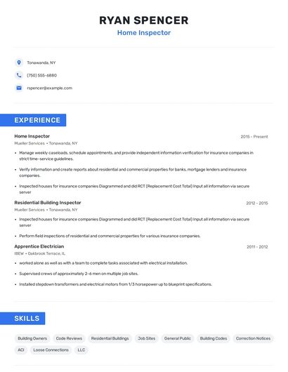 Build a professional home inspector resume in minutes. Browse through our resume examples to identify the best way to word your resume. Then choose from 5+ resume templates to create your home inspector resume.