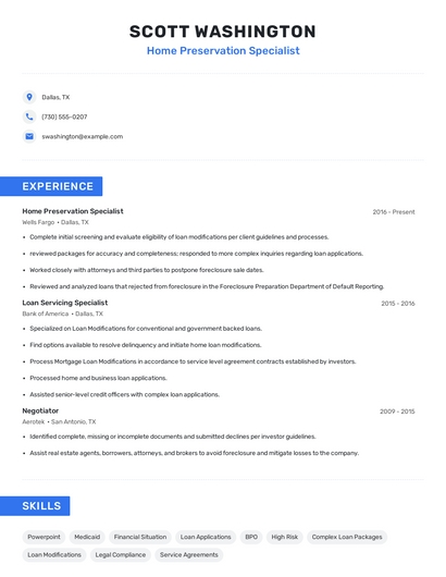 Build a professional home preservation specialist resume in minutes. Browse through our resume examples to identify the best way to word your resume. Then choose from 5+ resume templates to create your home preservation specialist resume.
