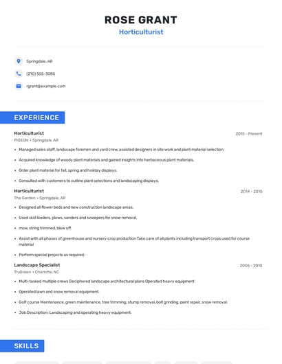 Build a professional horticulturist resume in minutes. Browse through our resume examples to identify the best way to word your resume. Then choose from 5+ resume templates to create your horticulturist resume.
