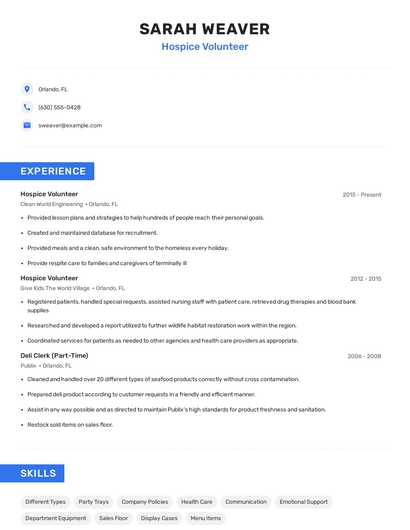 Build a professional hospice volunteer resume in minutes. Browse through our resume examples to identify the best way to word your resume. Then choose from 5+ resume templates to create your hospice volunteer resume.