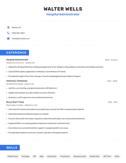 Build a professional hospital administrator resume in minutes. Browse through our resume examples to identify the best way to word your resume. Then choose from 5+ resume templates to create your hospital administrator resume.