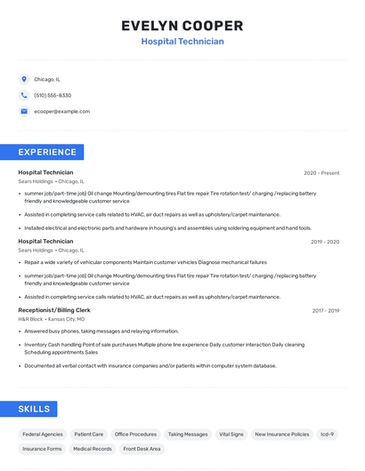 Build a professional hospital technician resume in minutes. Browse through our resume examples to identify the best way to word your resume. Then choose from 5+ resume templates to create your hospital technician resume.