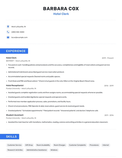Build a professional hotel clerk resume in minutes. Browse through our resume examples to identify the best way to word your resume. Then choose from 5+ resume templates to create your hotel clerk resume.