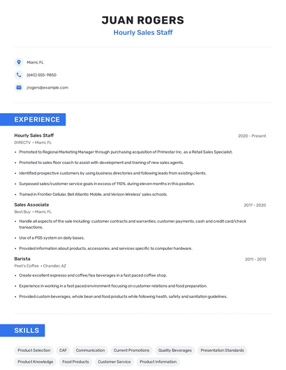 Build a professional hourly sales staff resume in minutes. Browse through our resume examples to identify the best way to word your resume. Then choose from 5+ resume templates to create your hourly sales staff resume.