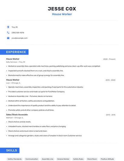 Build a professional house worker resume in minutes. Browse through our resume examples to identify the best way to word your resume. Then choose from 5+ resume templates to create your house worker resume.