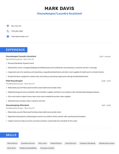 Build a professional housekeeper/laundry assistant resume in minutes. Browse through our resume examples to identify the best way to word your resume. Then choose from 5+ resume templates to create your housekeeper/laundry assistant resume.