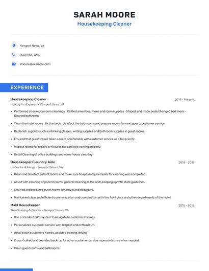 Build a professional housekeeping cleaner resume in minutes. Browse through our resume examples to identify the best way to word your resume. Then choose from 5+ resume templates to create your housekeeping cleaner resume.