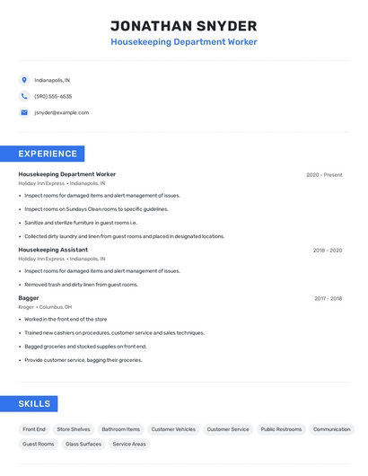 Build a professional housekeeping department worker resume in minutes. Our AI resume writing assistant will guide you through every step of the process, and you can choose from 10+ resume templates to create your housekeeping department worker resume.7. Clean Linen