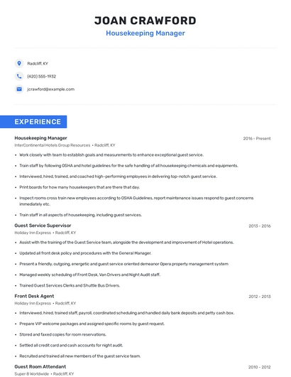 Build a professional housekeeping manager resume in minutes. Browse through our resume examples to identify the best way to word your resume. Then choose from 5+ resume templates to create your housekeeping manager resume.