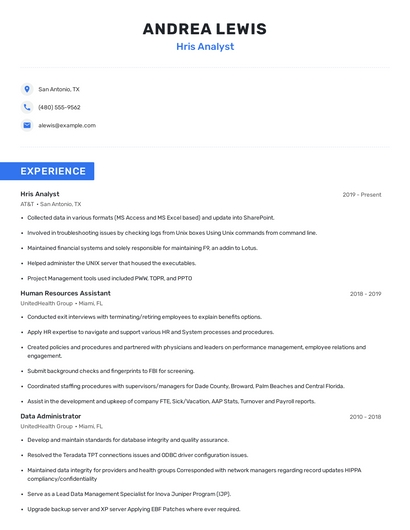 Build a professional hris analyst resume in minutes. Browse through our resume examples to identify the best way to word your resume. Then choose from 5+ resume templates to create your hris analyst resume.