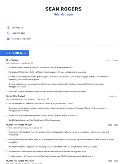 Build a professional hris manager resume in minutes. Browse through our resume examples to identify the best way to word your resume. Then choose from 5+ resume templates to create your hris manager resume.