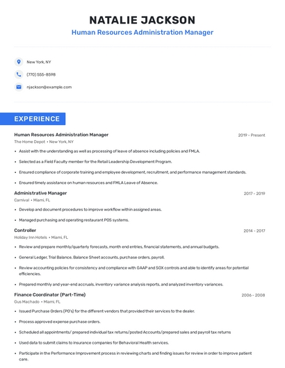 Build a professional human resources administration manager resume in minutes. Browse through our resume examples to identify the best way to word your resume. Then choose from 5+ resume templates to create your human resources administration manager resume.