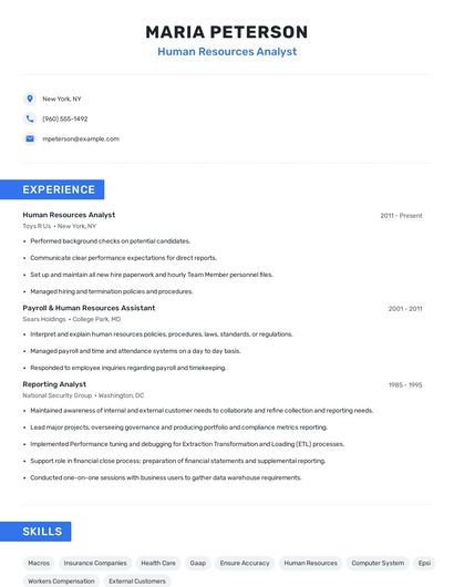 Build a professional human resources analyst resume in minutes. Browse through our resume examples to identify the best way to word your resume. Then choose from 5+ resume templates to create your human resources analyst resume.