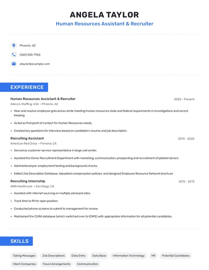 Build a professional human resources assistant & recruiter resume in minutes. Browse through our resume examples to identify the best way to word your resume. Then choose from 5+ resume templates to create your human resources assistant & recruiter resume.