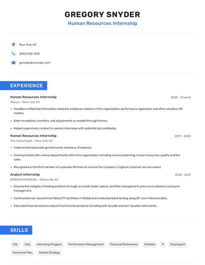 Build a professional human resources internship resume in minutes. Browse through our resume examples to identify the best way to word your resume. Then choose from 5+ resume templates to create your human resources internship resume.