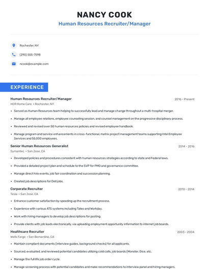 Build a professional human resources recruiter/manager resume in minutes. Browse through our resume examples to identify the best way to word your resume. Then choose from 5+ resume templates to create your human resources recruiter/manager resume.