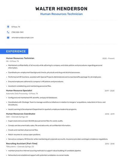 Build a professional human resources technician resume in minutes. Browse through our resume examples to identify the best way to word your resume. Then choose from 5+ resume templates to create your human resources technician resume.