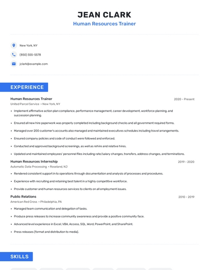 Build a professional human resources trainer resume in minutes. Browse through our resume examples to identify the best way to word your resume. Then choose from 5+ resume templates to create your human resources trainer resume.