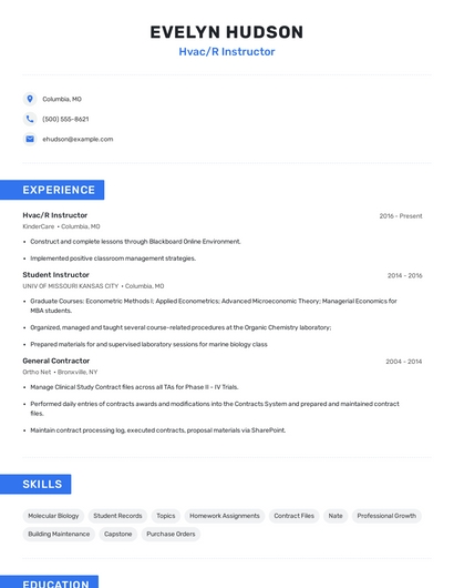 Build a professional hvac/r instructor resume in minutes. Browse through our resume examples to identify the best way to word your resume. Then choose from 5+ resume templates to create your hvac/r instructor resume.