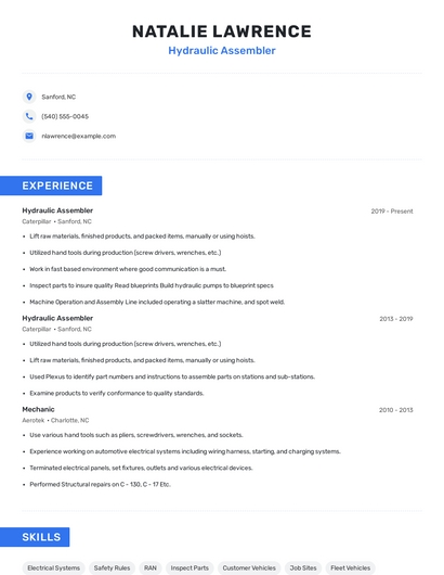 Build a professional hydraulic assembler resume in minutes. Browse through our resume examples to identify the best way to word your resume. Then choose from 5+ resume templates to create your hydraulic assembler resume.