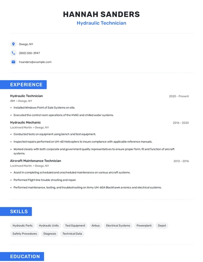 Build a professional hydraulic technician resume in minutes. Browse through our resume examples to identify the best way to word your resume. Then choose from 5+ resume templates to create your hydraulic technician resume.