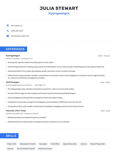 Build a professional hydrogeologist resume in minutes. Browse through our resume examples to identify the best way to word your resume. Then choose from 5+ resume templates to create your hydrogeologist resume.