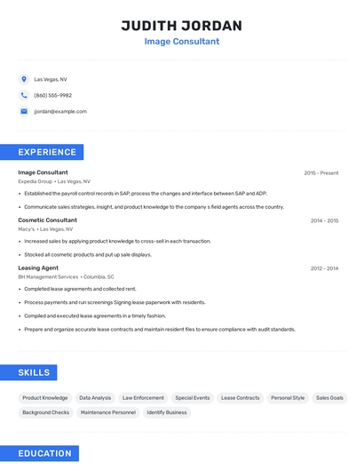 Build a professional image consultant resume in minutes. Browse through our resume examples to identify the best way to word your resume. Then choose from 5+ resume templates to create your image consultant resume.