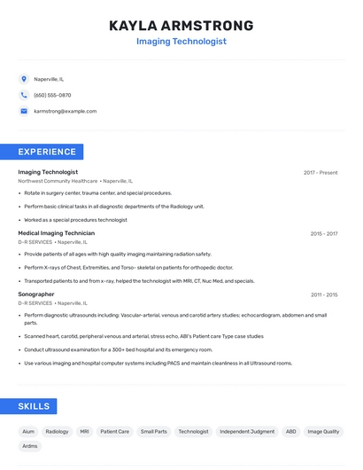 Build a professional imaging technologist resume in minutes. Browse through our resume examples to identify the best way to word your resume. Then choose from 5+ resume templates to create your imaging technologist resume.