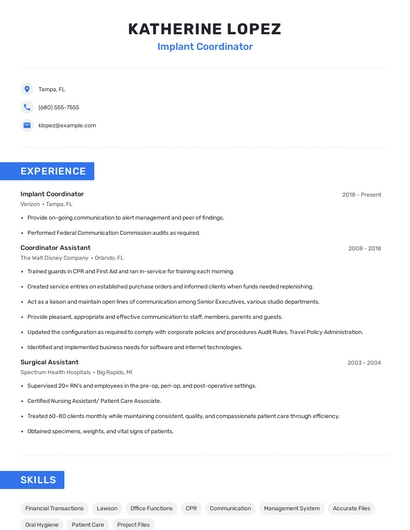 Build a professional implant coordinator resume in minutes. Browse through our resume examples to identify the best way to word your resume. Then choose from 5+ resume templates to create your implant coordinator resume.