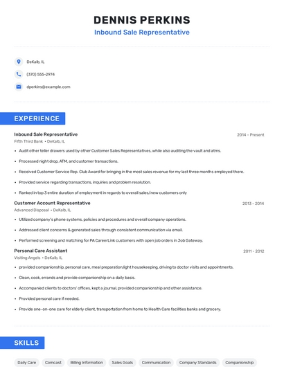 Build a professional inbound sale representative resume in minutes. Browse through our resume examples to identify the best way to word your resume. Then choose from 5+ resume templates to create your inbound sale representative resume.