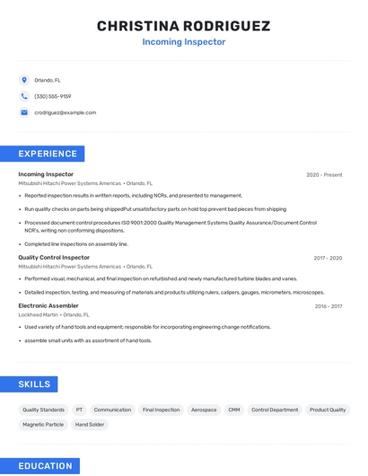 Build a professional incoming inspector resume in minutes. Browse through our resume examples to identify the best way to word your resume. Then choose from 5+ resume templates to create your incoming inspector resume.