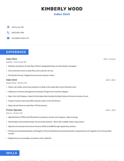 Choose from 10+ customizable index clerk resume templates