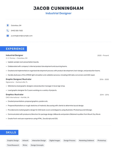 Build a professional industrial designer resume in minutes. Browse through our resume examples to identify the best way to word your resume. Then choose from 5+ resume templates to create your industrial designer resume.