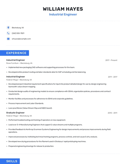 Build a professional industrial engineer resume in minutes. Browse through our resume examples to identify the best way to word your resume. Then choose from 5+ resume templates to create your industrial engineer resume.