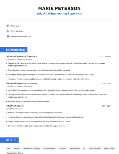 Build a professional industrial engineering supervisor resume in minutes. Browse through our resume examples to identify the best way to word your resume. Then choose from 5+ resume templates to create your industrial engineering supervisor resume.