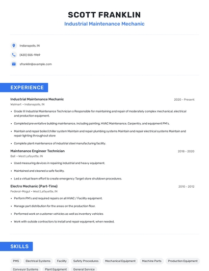 Build a professional industrial maintenance mechanic resume in minutes. Browse through our resume examples to identify the best way to word your resume. Then choose from 5+ resume templates to create your industrial maintenance mechanic resume.