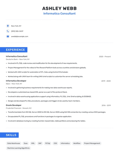 Build a professional informatica consultant resume in minutes. Browse through our resume examples to identify the best way to word your resume. Then choose from 5+ resume templates to create your informatica consultant resume.