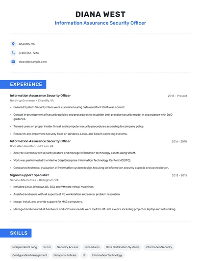 Build a professional information assurance security officer resume in minutes. Browse through our resume examples to identify the best way to word your resume. Then choose from 5+ resume templates to create your information assurance security officer resume.