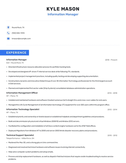 Build a professional information manager resume in minutes. Browse through our resume examples to identify the best way to word your resume. Then choose from 5+ resume templates to create your information manager resume.