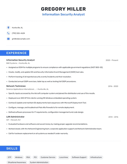 Build a professional information security analyst resume in minutes. Browse through our resume examples to identify the best way to word your resume. Then choose from 5+ resume templates to create your information security analyst resume.