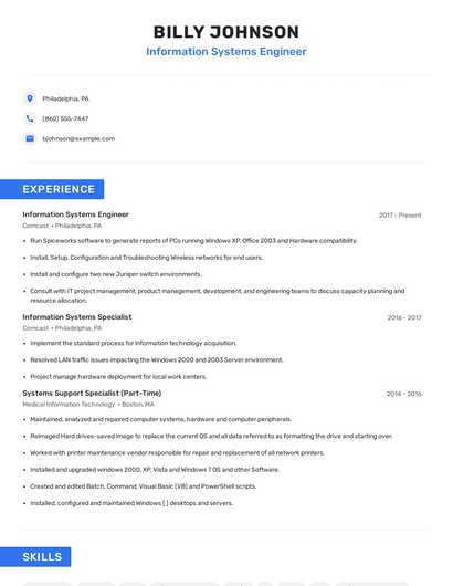 Build a professional information systems engineer resume in minutes. Browse through our resume examples to identify the best way to word your resume. Then choose from 5+ resume templates to create your information systems engineer resume.
