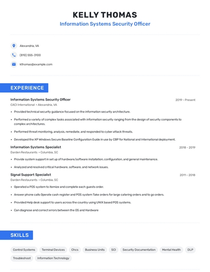 Build a professional information systems security officer resume in minutes. Browse through our resume examples to identify the best way to word your resume. Then choose from 5+ resume templates to create your information systems security officer resume.