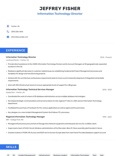 Build a professional information technology director resume in minutes. Browse through our resume examples to identify the best way to word your resume. Then choose from 5+ resume templates to create your information technology director resume.